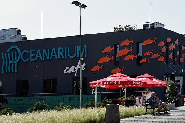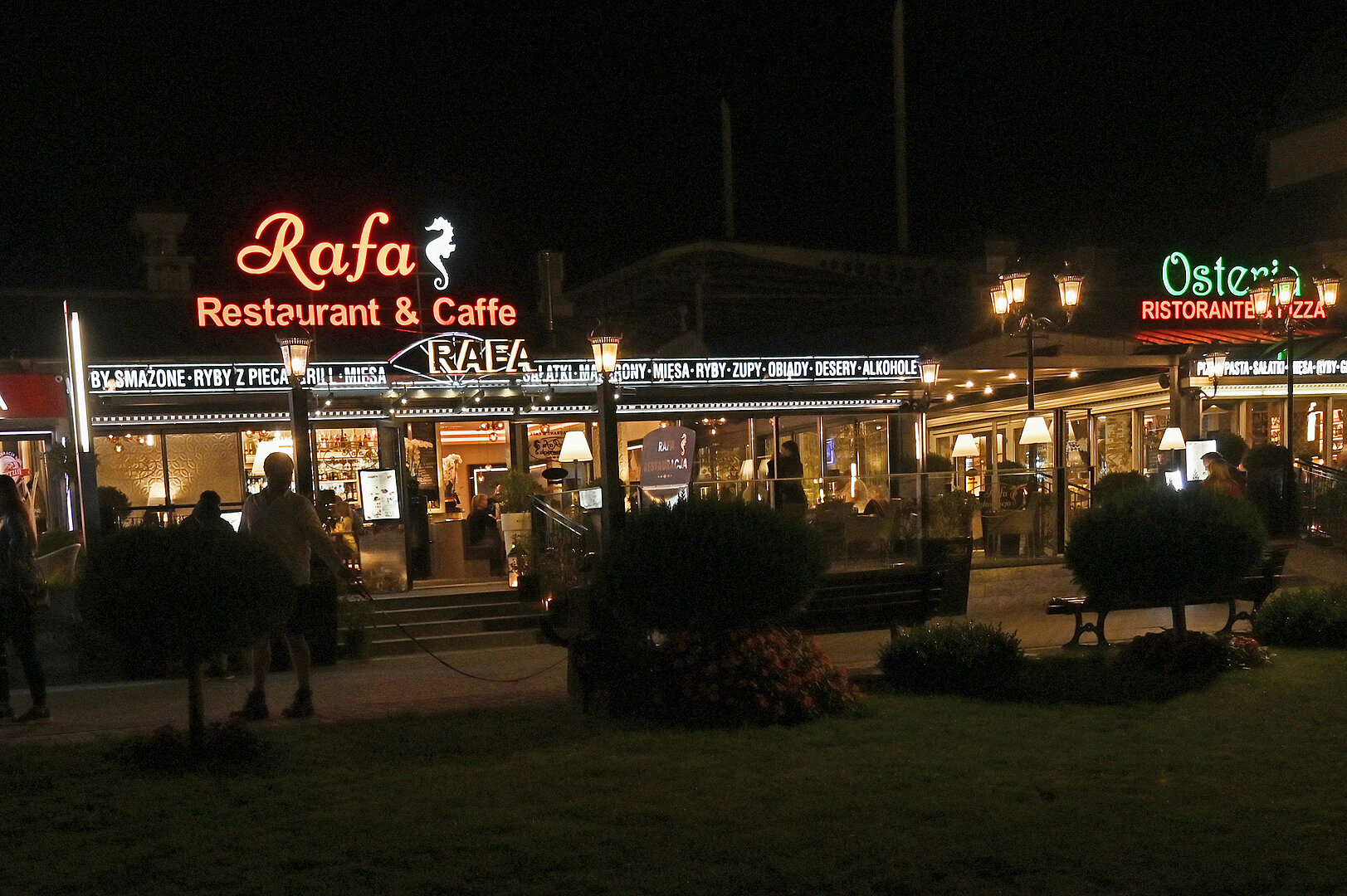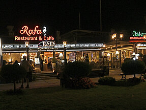 Die Promenade Misdroys erstreckt sich über mehrere Kilometer zwischen dem früheren Gebäude der Seenotrettung im Osten und dem hoch aufragenden, vielstöckigen Appartementhaus „Aquamarina Onyx“ im Westen.